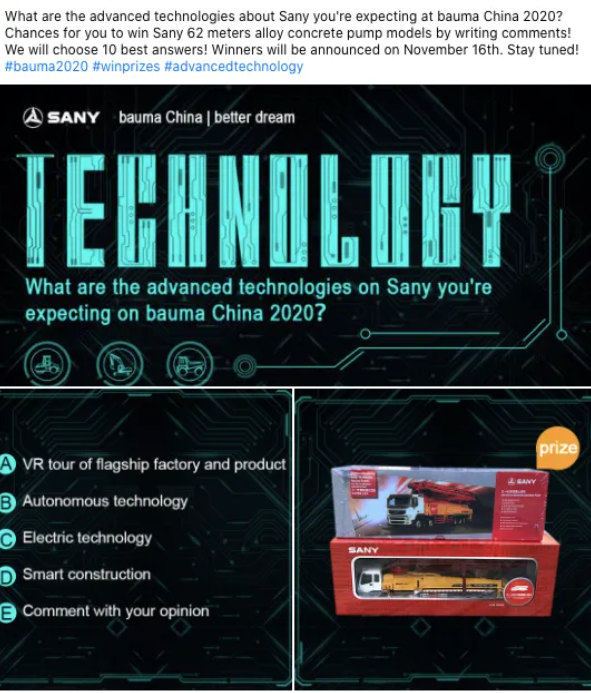 在2020年的Bauma CHINA期間,三一集團(tuán)曾經(jīng)以#Bauma2020為主話題,積極地在社交媒體上進(jìn)行宣傳和營銷。他們共發(fā)布了將近20條與該話題相關(guān)的文章,占據(jù)了整個(gè)11月份發(fā)文總數(shù)將近7成??梢哉f,在那個(gè)月份,三一集團(tuán)的Facebook主頁幾乎都在圍繞這一話題展開各種營銷活動(dòng)。